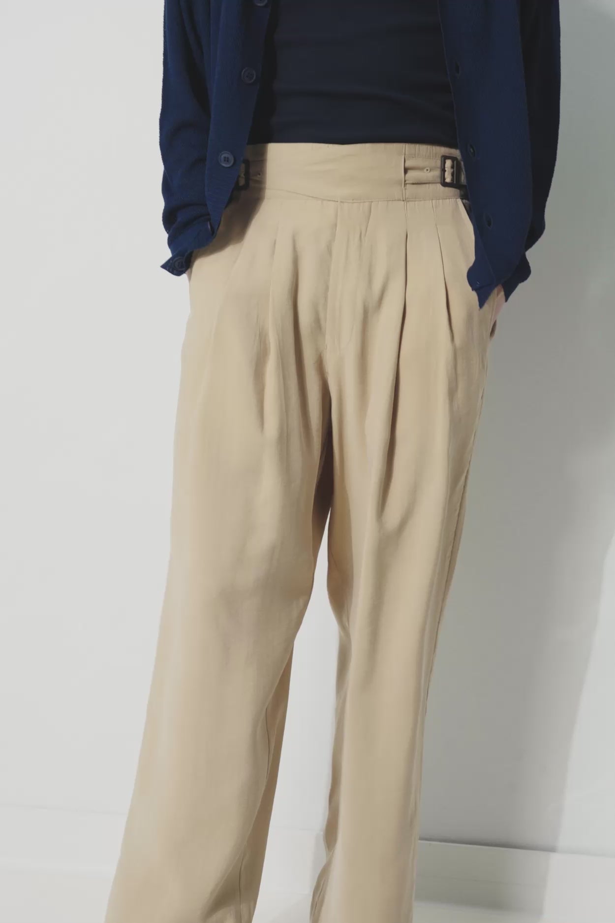 ÇİFT KEMER DETAYLI PİLİLİ BEJ MODAL PANTOLON